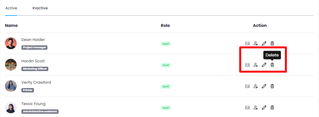 You can delete an employee anytime by clicking on the delete icon from the user list.