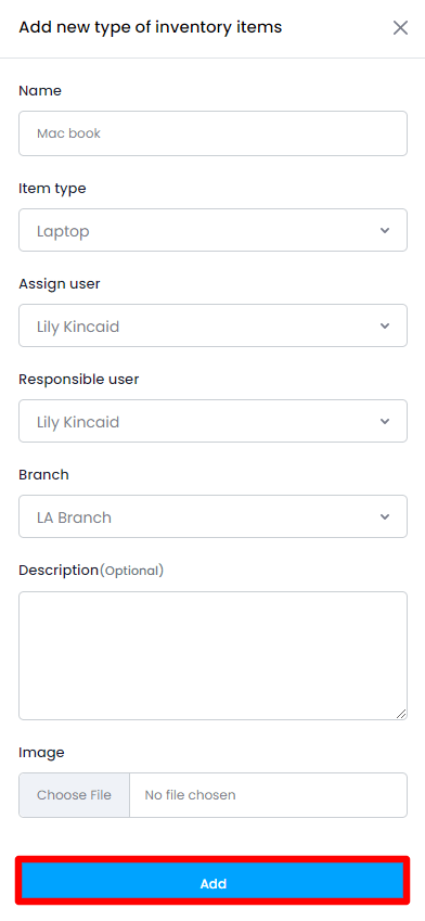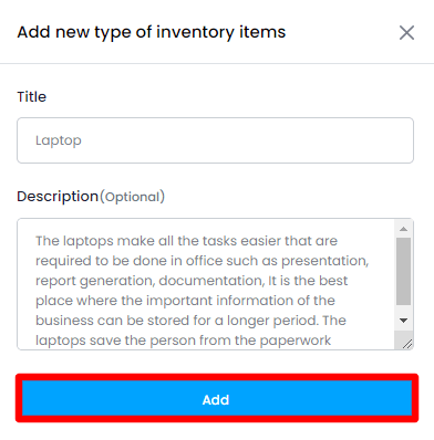 To add a new inventory click on the "Add new type of item" button from the right side.