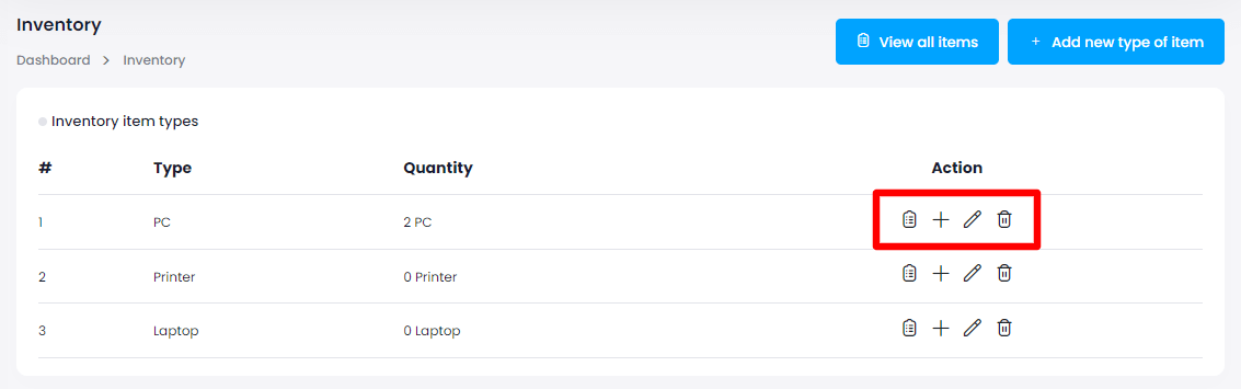 You can add, edit, and delete inventory by clicking on the icons from the action bar.