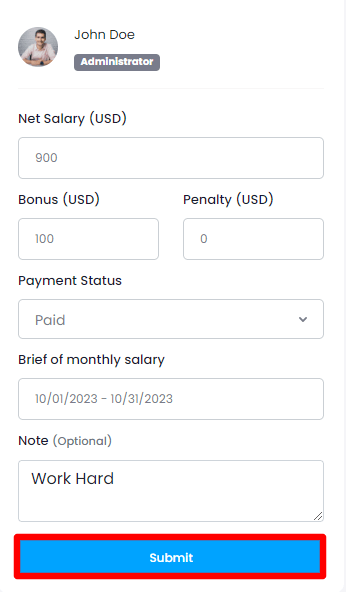 The new month's salary status will be marked as unpaid for all users. Click on the "+" icon from the user list to generate the invoice.