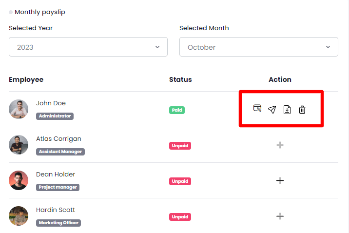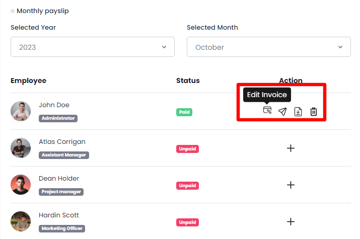 You can send the invoice to the employee's email by clicking on the send invoice icon from the action bar. You can also download and delete the invoice by clicking on the download and delete icons from the action bar.