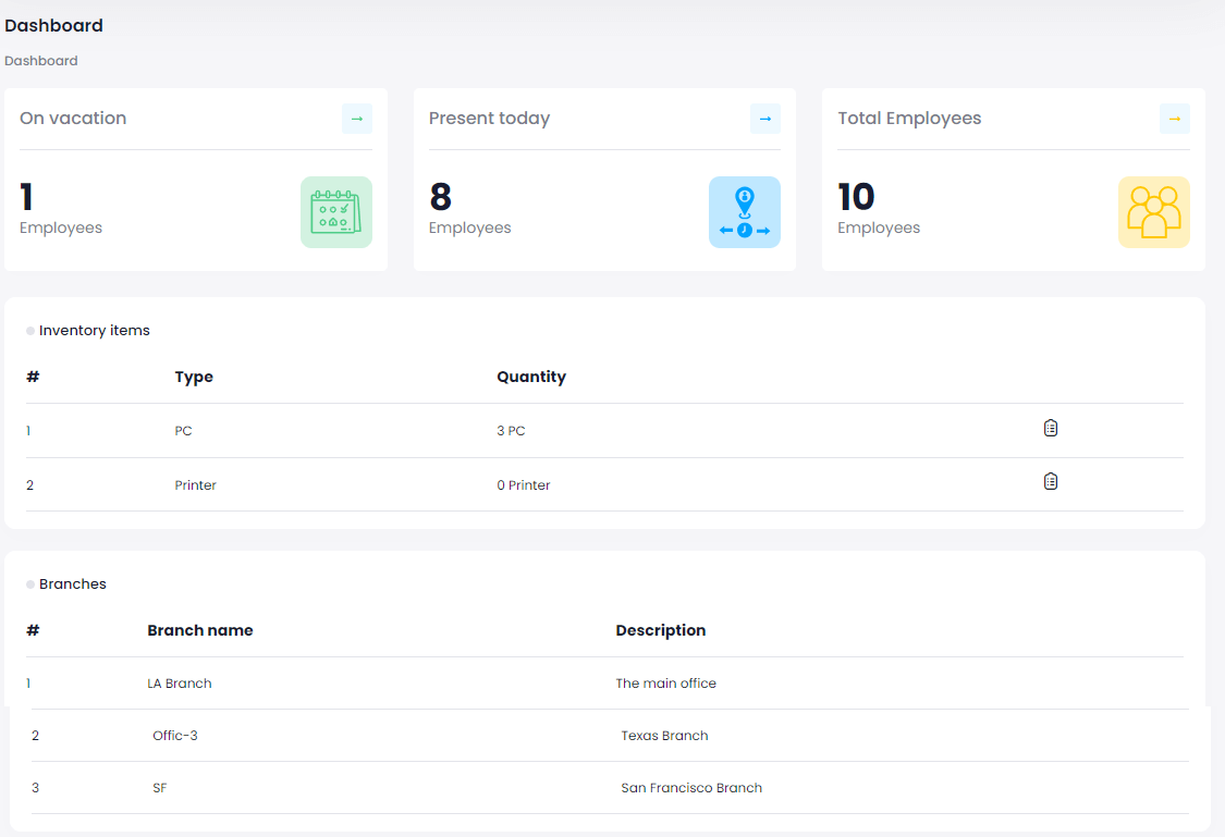 Here in the dashboard, you can view all the information in one place. Total employee list, employee attendance, the employee who is on vacation every detail in this place.