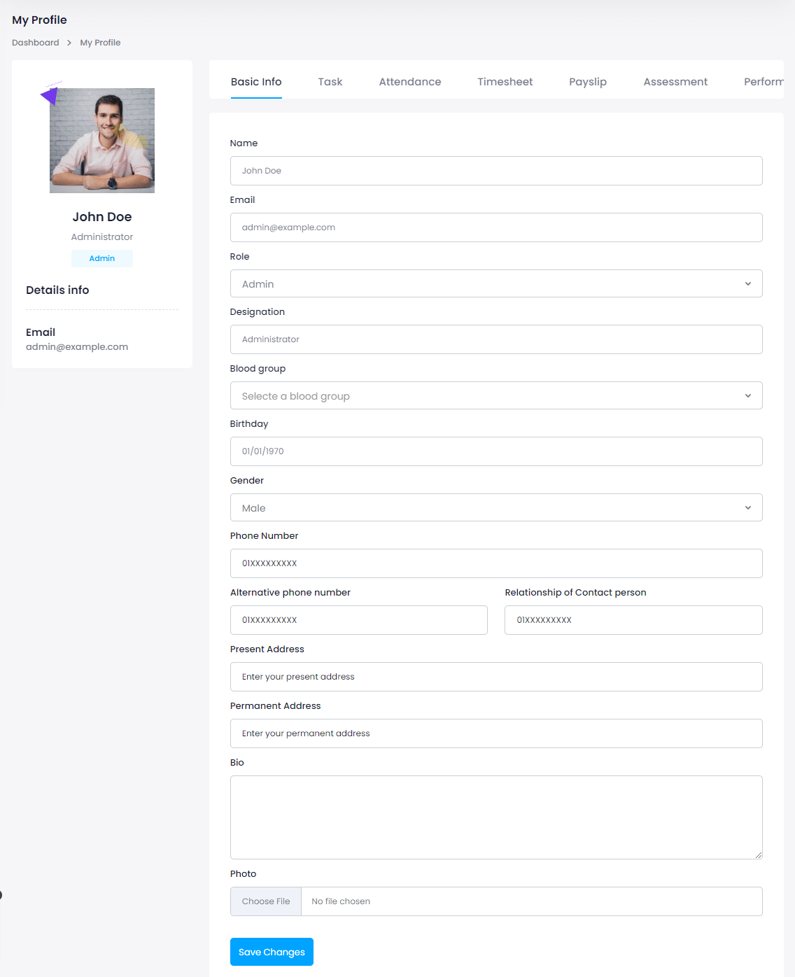 As an Admin you have the option to manage your profile information and modify them anytime from the admin panel. You can view your tasks, payslip, timesheet, attendance, and every detail in this profile section.
