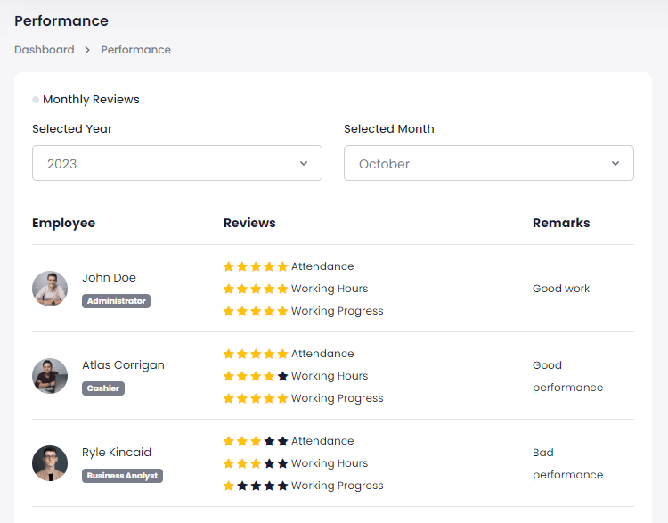 As an admin, you can give and manage ratings to all the other employees from this section.