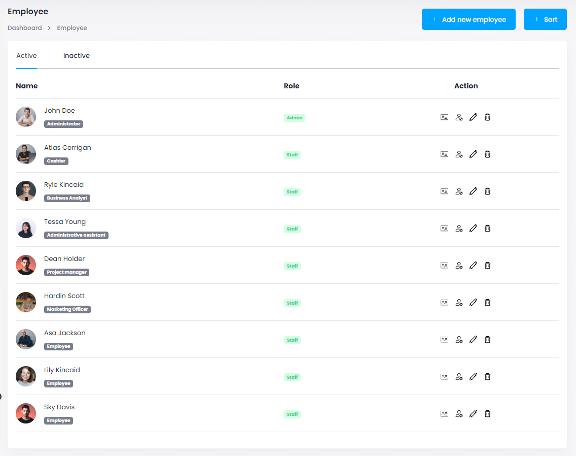 You can add and manage employee lists from this section. You can mark them as inactive, view their profile information, and manage the information from this section.