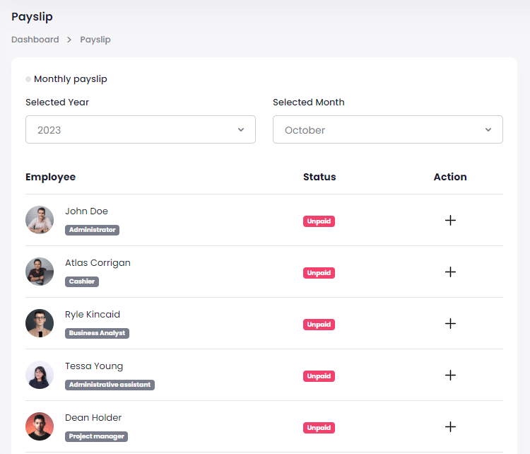 Here you can view all the employees' lists along with their payment status. As an admin, you can generate their payment and update the changes from the admin panel.