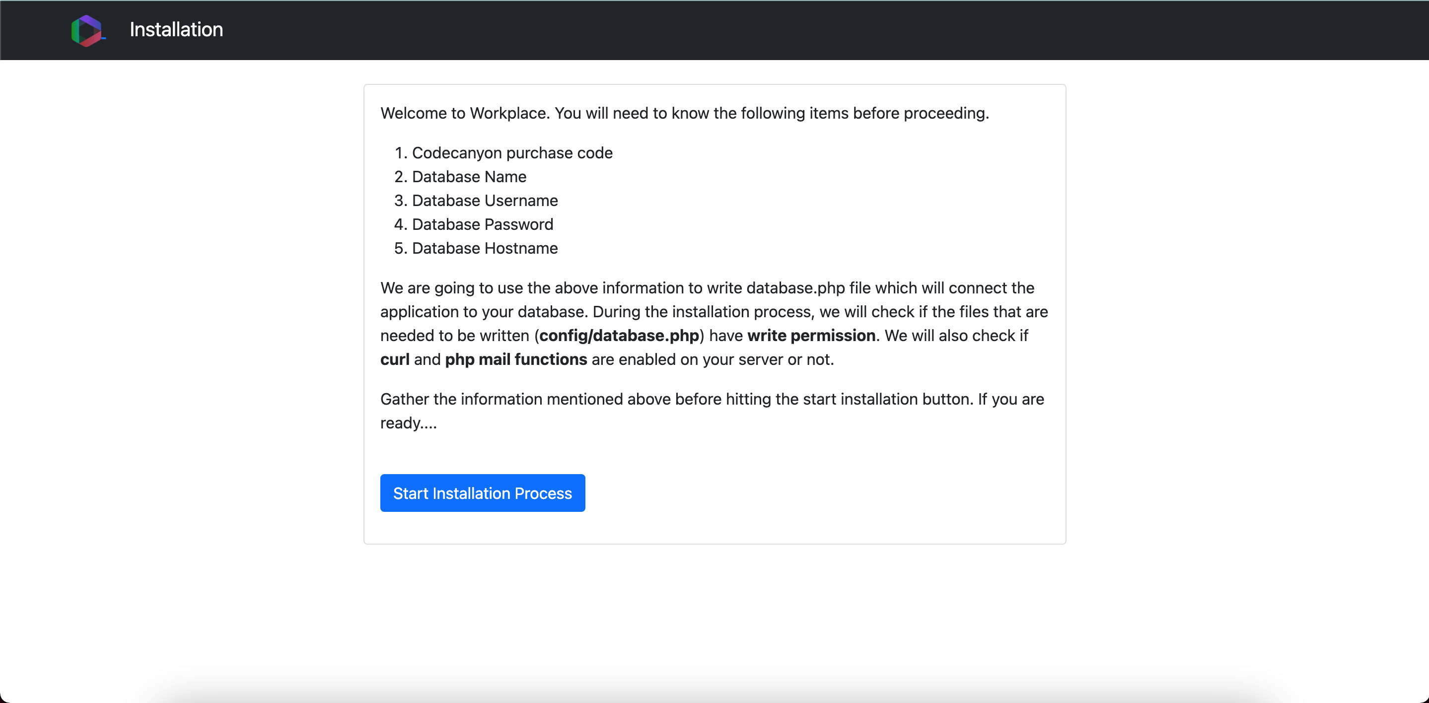 The first step is installation. Before starting, you will need to have the CodeCanyon purchase code, the database name, username, password, and the database host in the installation process. You can get the purchase code from your purchase information on Codecanyon. You will need to create a new database on your server to have the database information. You will also need to ensure that the files in /application/config/database.php and /application/config/routes.php have written permission. You should also verify if your server has PHP CURL enabled. after you hit the "Start Installation Process" button.
