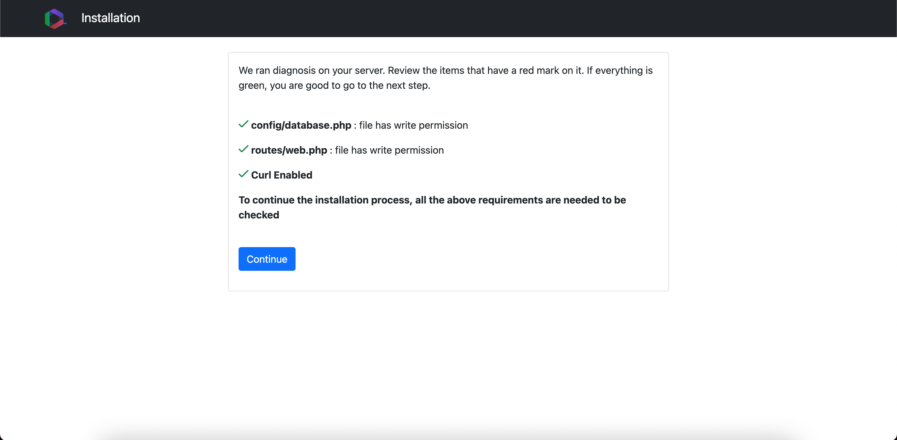 If everything is fine and has a green check-mark on every required file, click on the "Continue" button.