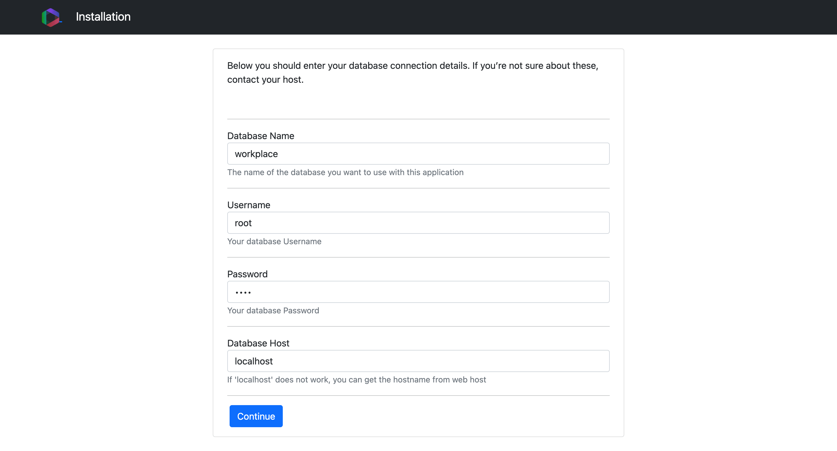 You have to provide the previously created database credentials correctly. & then click on the "Continue" button.