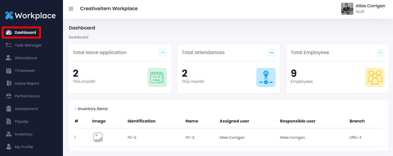 Here in this section, your users can view their monthly attendance number, leave applications, total employee list, and the Inventory items list they are assigned.