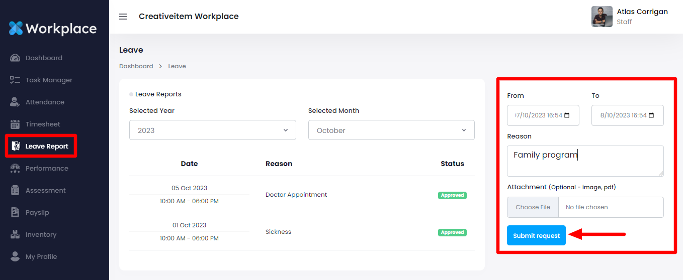 To create a leave report your users need to select time, write down the reason, and attach a picture from the right side. Then click on the "Submit Request" button to create a leave application.