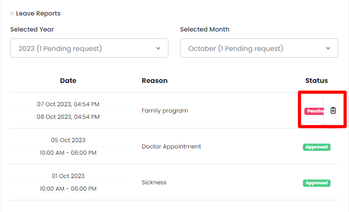 Your users can request leave from their user panel. As an admin, you have the permission to approve and reject the application. The below steps can be followed for managing leave report in the user panel: