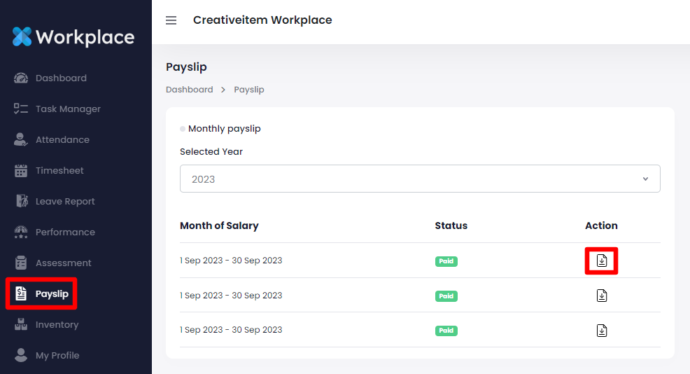 Your users can view their payslip status and download their invoice by clicking on the download icon from the action bar. The below steps can be followed for this: