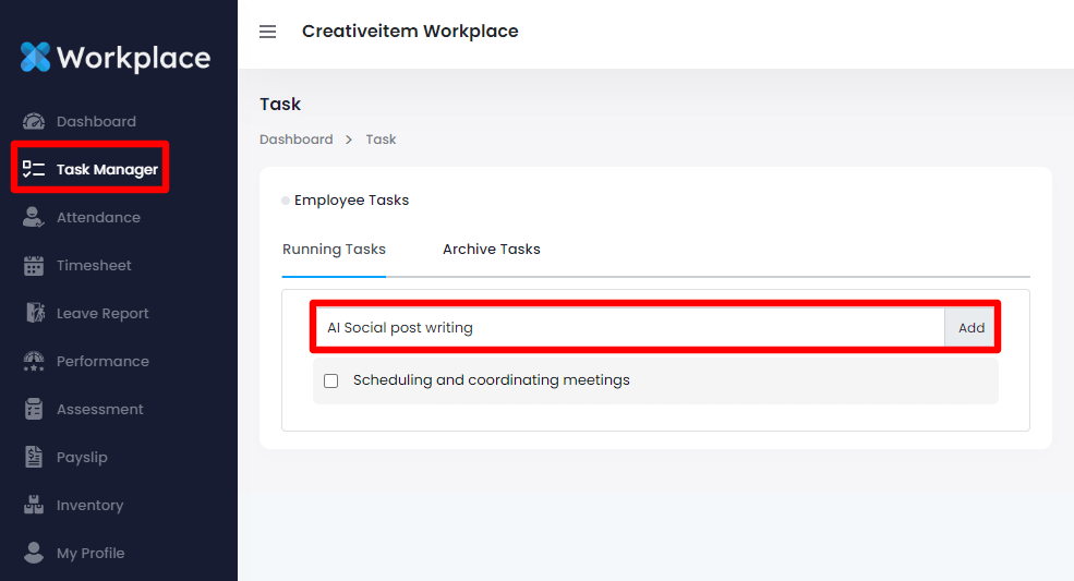 To add a new task your users need to write down the task title and then click on the "Add" button to add a new task.